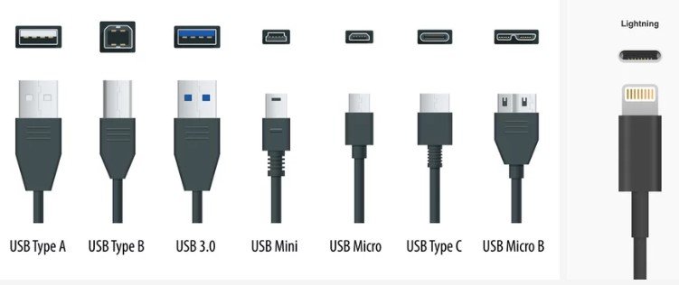 - Lightning: Proprietary connector used by Apple for iPhones, iPads, and iPods.